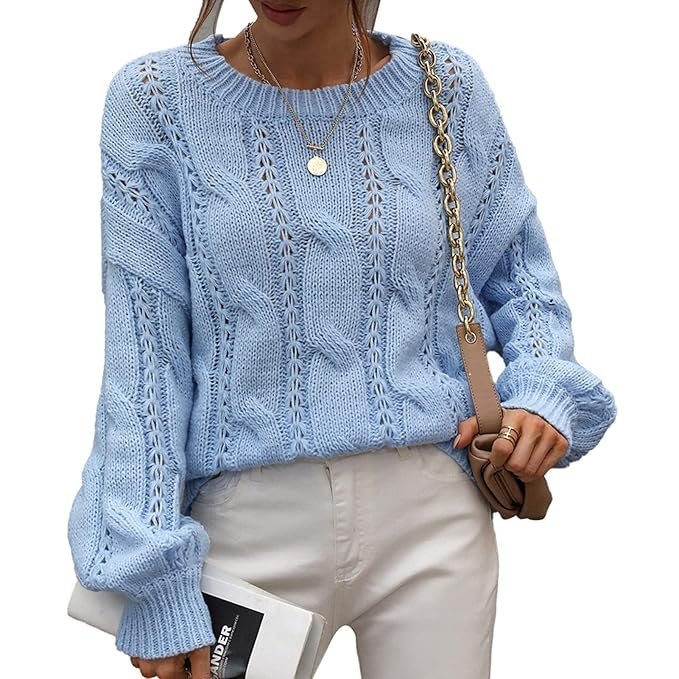 Crewneck Pullover Sweater, Long Sleeve Sweater Cable Knit Pure Color for Dating (S) Blue