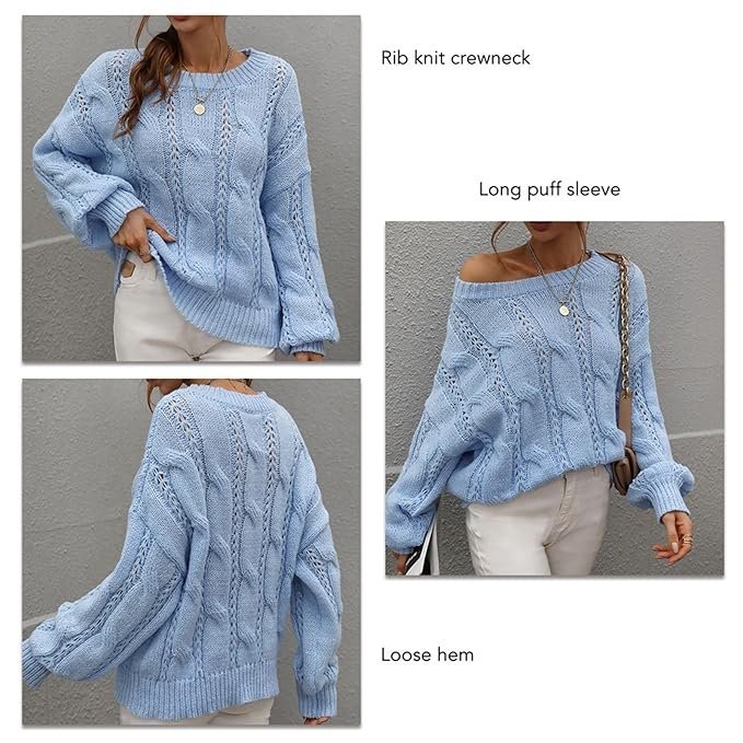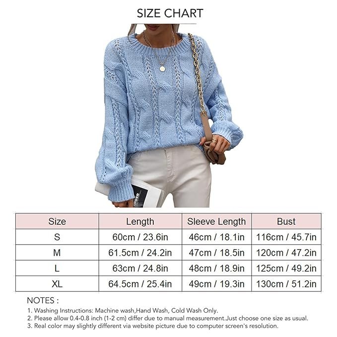 Crewneck Pullover Sweater, Long Sleeve Sweater Cable Knit Pure Color for Dating (S) BlueCrewneck Pullover Sweater, Long Sleeve Sweater Cable Knit Pure Color for Dating (S) Blue