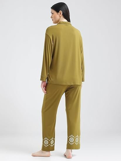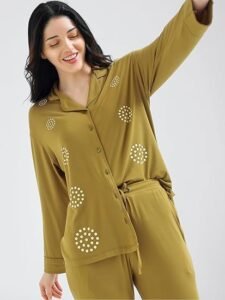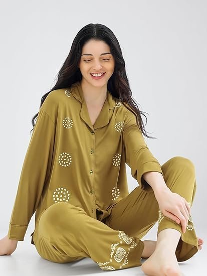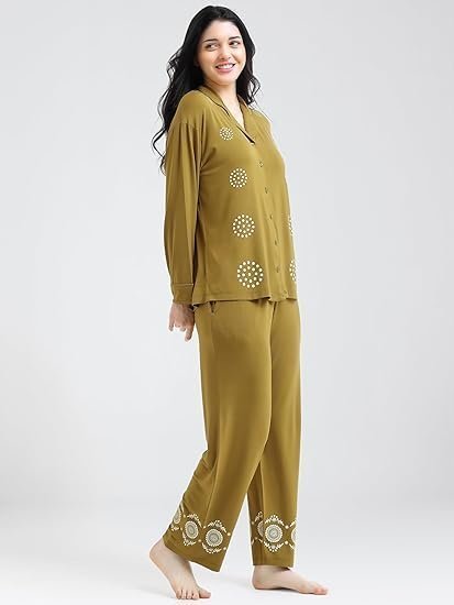 Night Suit for Womens Mustard Geometric Printed Modal Night Dress of Shirt and pajama Set