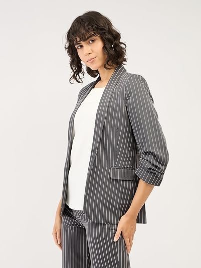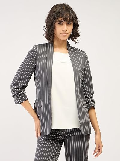 • Grey & White Stripes: A sophisticated combination of charcoal grey and white stripes gives this blazer a stylish, modern appearance that complements a wide range of outfits.