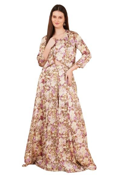Floral Three-Piece Lehenga Set, Crop Top and koti with Long Skirt, Vintage Print Indo-Western Dress