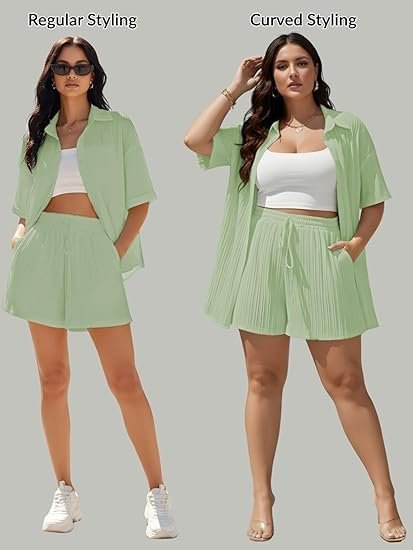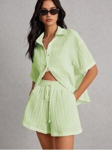 - Elegant Pleated Texture: Features fine pleated detailing on both the shirt and shorts, adding a stylish, structured look to this casual set.