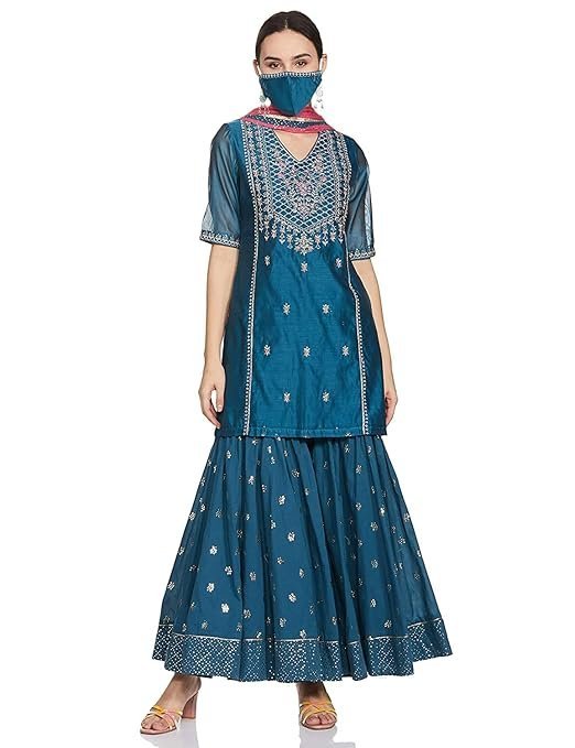 Women Teal Poly Cotton Kurta Garara Suit SetWomen Teal Poly Cotton Kurta Garara Suit Set