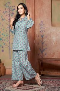 - Pant:- The Pant Has a Wide Leg Style & an Elasticated Waistband || Top:- the Top Has a 3/4 Sleeve and Hip Length Top. || Sleeve Style:-