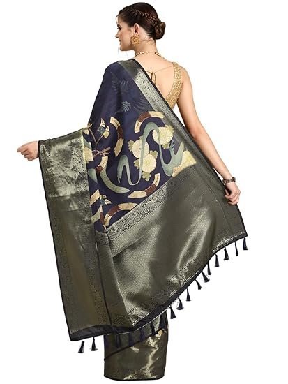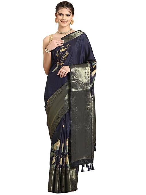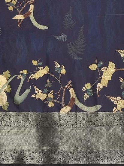 • Saree Details: Color: Navy Blue | Fabric: Kanchipuram Silk | Work Type: Digital Print | Pattern: Floral | Length: 5.5 mtr