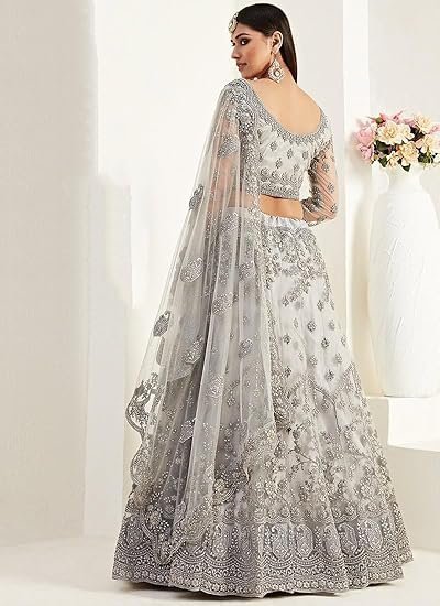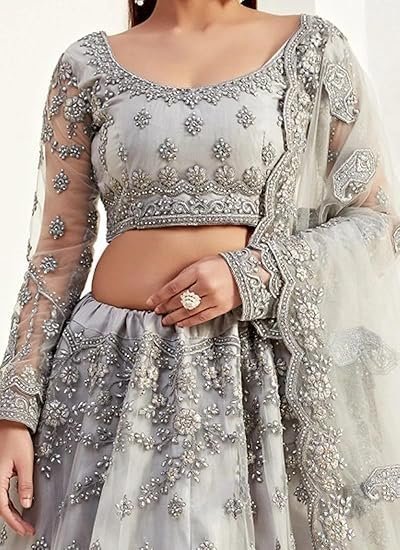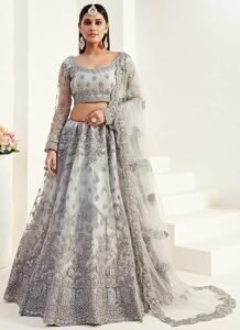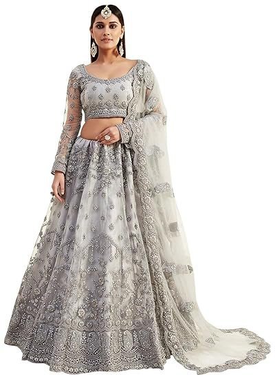 - Make an adorable statement in this smashy grey net A line lehenga.
