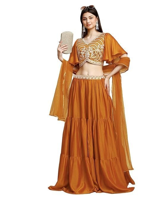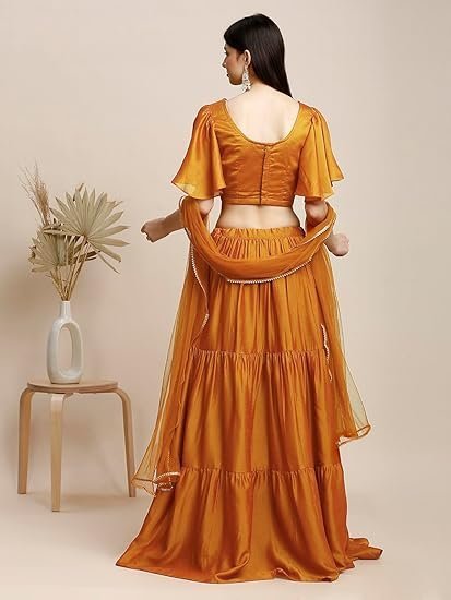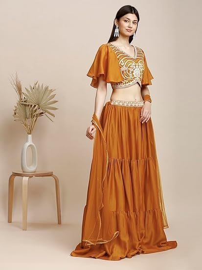 - STAND OUT FROM THE REST: Keeping in mind the latest fashion trends, this designer Kurti is made to help you make a bold fashion statement. The solid Orange Lehenga,Aliyacut Choli With Dupatta dress for women’s Latest Design pattern highlights the color of your choice which is accented further.
