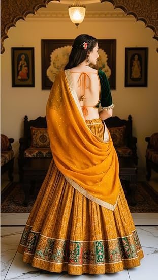 - DESIGN ELEMENTS: Stunning mustard yellow lehenga choli set featuring intricate embroidery work on the blouse and decorative border detailing on the skirt